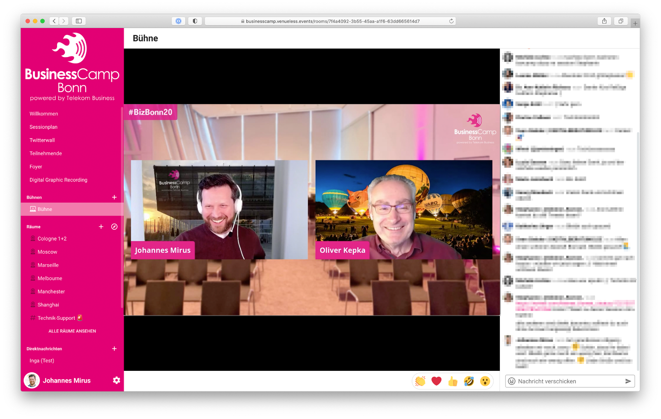 Sascha: Mir ist besonders das Thema "Augenhöhe" wichtig. Bei unseren Veranstaltungen möchte ich nicht, dass die Remote-Teilnehmenden sich wie Gäste zweiter Klasse fühlen, weil sie weniger Beteiligungsmöglichkeiten erhalten, als die Menschen vor Ort. Dazu gehört es auch, dass es im besten Fall eine doppelte Moderation gibt, sodass Menschen vor Ort auch digital zugeschaltet zu Wort kommen können. All das ist keine Zauberkunst mehr, wenn man Venueless in seinem vollem Umfang einzusetzen weiß.
